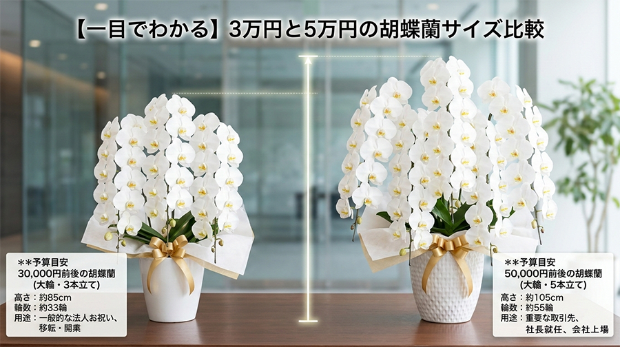 このページでは、胡蝶蘭のサイズと輪数の違い、用途別の選び方をわかりやすく解説します。